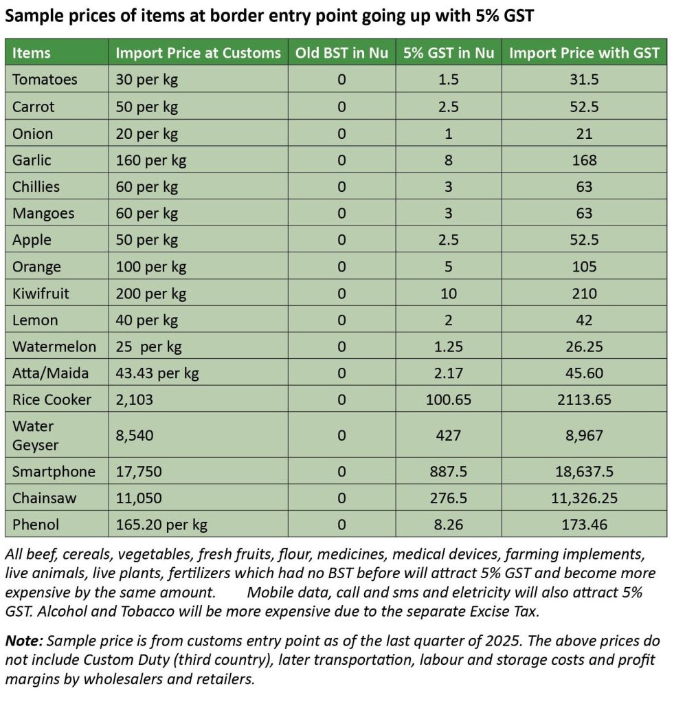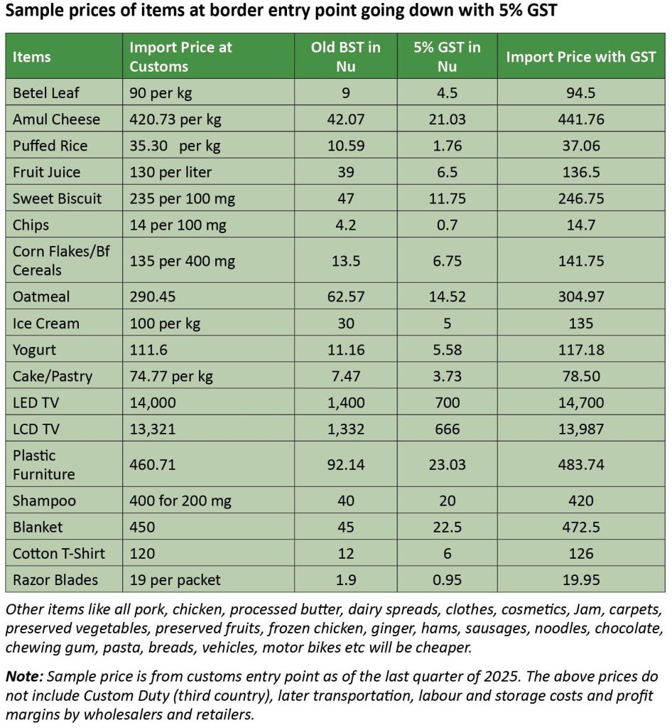 Department of Revenue and Customs (DRC) Commissioner Sherab Chogyel, said, “People are facing a sudden price increase mainly due to old stocks which had been charged Bhutan Sales Tax (BST) also being charged the GST. Once the old stocks are sold out and items are charged only GST, then price increases will either be more moderate and many items’ prices will also come down.”