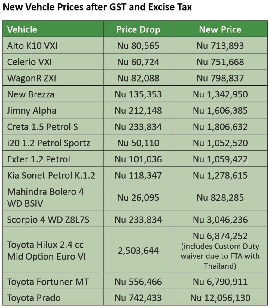 There will also be reductions in the prices of cars which is not only due to a lower GST of 5% but also due to the doing away with the Green Tax, which was inserted into the Excise Tax (see box).