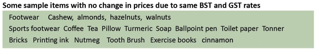 While prices go up and down, there are also certain products whose prices will remain the same, as their old BST and new GST rates are same. These products are footwear, cashew, almonds, hazelnuts, walnuts, sports footwear,  coffee, tea, pillow, turmeric, soap, ballpoint pen, toilet paper, toner, bricks, printing ink, nutmeg, toothbrush, exercise books, cinnamon, etc.