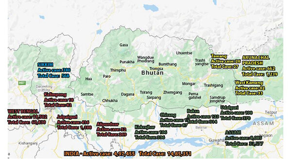 West Bengal has 60,830 cases of which there are 19,502 active cases. Within West Bengal three districts that adjoin Bhutan are; Kalimpong with 82 total cases and 18 active cases; Jalpaiguri with 1,188 cases and 416 active cases; and Alipurduar with 269 cases and 52 active cases. Some of these active cases are in Jaigaon.