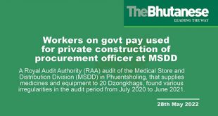 A Royal Audit Authority (RAA) audit of the Medical Store and Distribution Division (MSDD) in Phuentsholing, that supplies medicines and equipment to 20 Dzongkhags, found various irregularities in the audit period from July 2020 to June 2021. The RAA came across several ghost workers in the list with the MSDD. …